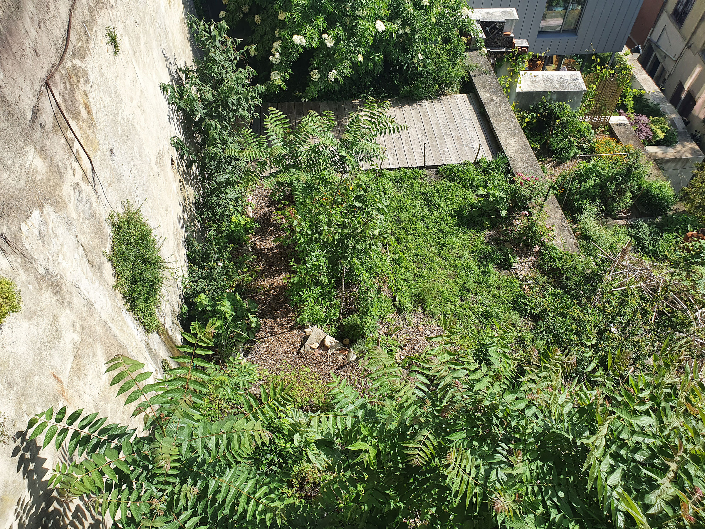 Des chantiers participatifs et festifs sont menés, transformant le lieu et soudant le groupe : défrichage d’une deuxième terrasse, plantation d’arbres et de vivaces, construction d’un hôtel à insectes et d’une terrasse en bois, semis et récoltes… Une dynamique est lancée, invitant tous ceux qui souhaitent jardiner en ville à intégrer l’équipe, de manière durable ou occasionnelle. Le Potager du Vieux Lyon est né !