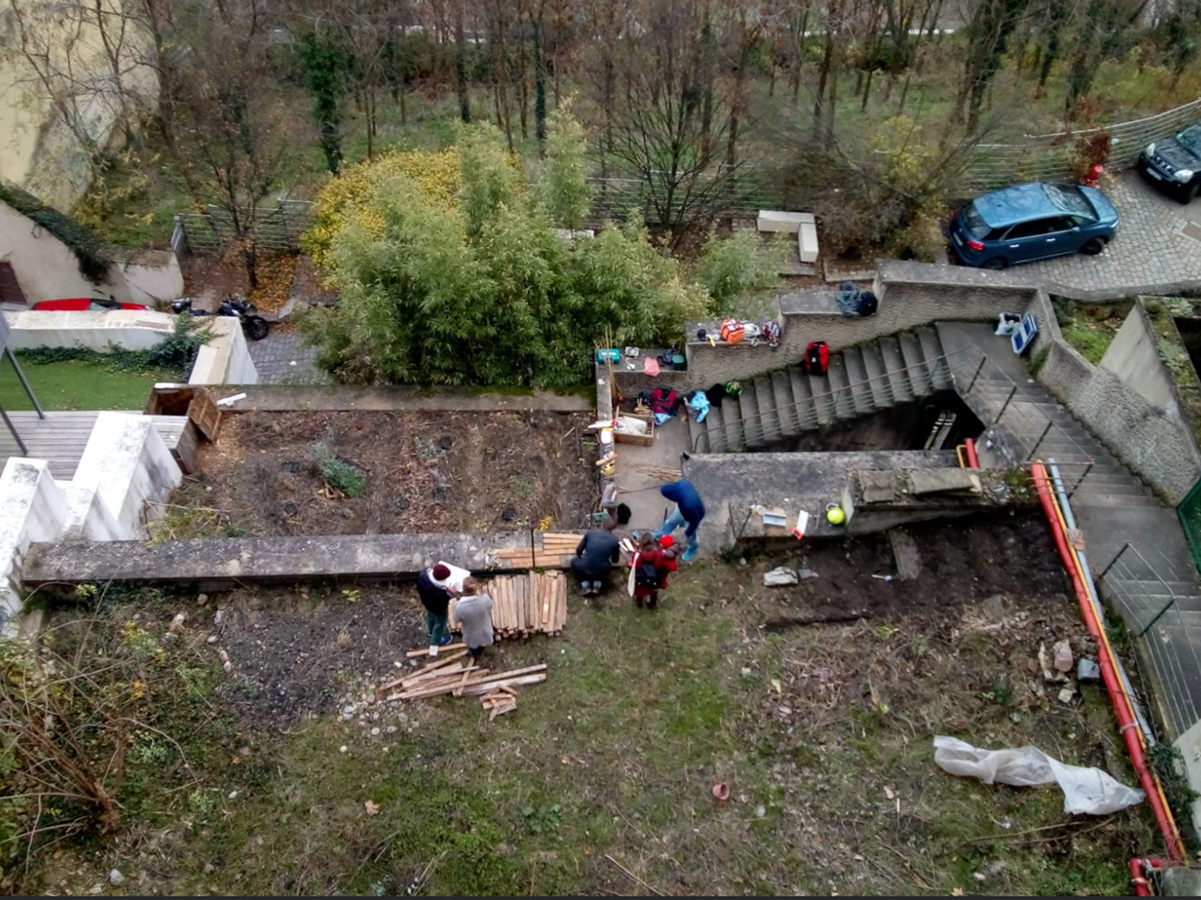 En 2015, la ville de Lyon souhaite vendre des terrains en friche jouxtant le siège de la Communauté du Chemin Neuf. Celle-ci saisit l’opportunité et acquiert les terrasses envahies par les ailantes, remplies de gravats et de déchets. Le sol semble aride et pauvre.